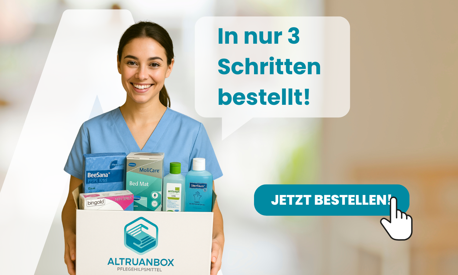 Zabezpečte si svoj zákonný nárok na pomôcky na opatrovanie podľa §40 SGB XI v hodnote 42€. AltruanBox zahŕňa komplexný servis okolo témy domácej starostlivosti, opatrovania a pomôcok na opatrovanie. Na prvom mieste je človek. Kladieme veľký dôraz na odľahčenie nielen osoby, ktorá potrebuje opatrovanie, ale aj jej príbuzných a poskytnutie čo najväčšej podpory.